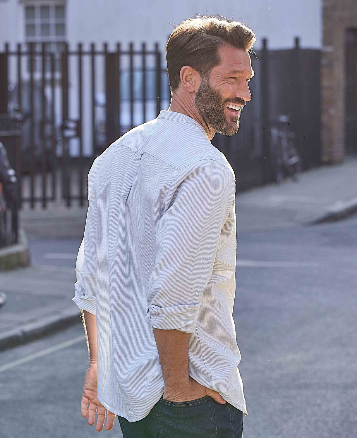 Perfect for warm weather, this blue summer-ready striped shirt is a stylish choice for the summer months. Crafted from linen and cotton, it combines the cooling, breathable properties of linen with the softness and wrinkle-resistance of cotton. The result is a comfortable, lightweight casual shirt that keeps you feeling fresh, whether you're spending a sunny day in the UK or exploring a beachside town abroad.