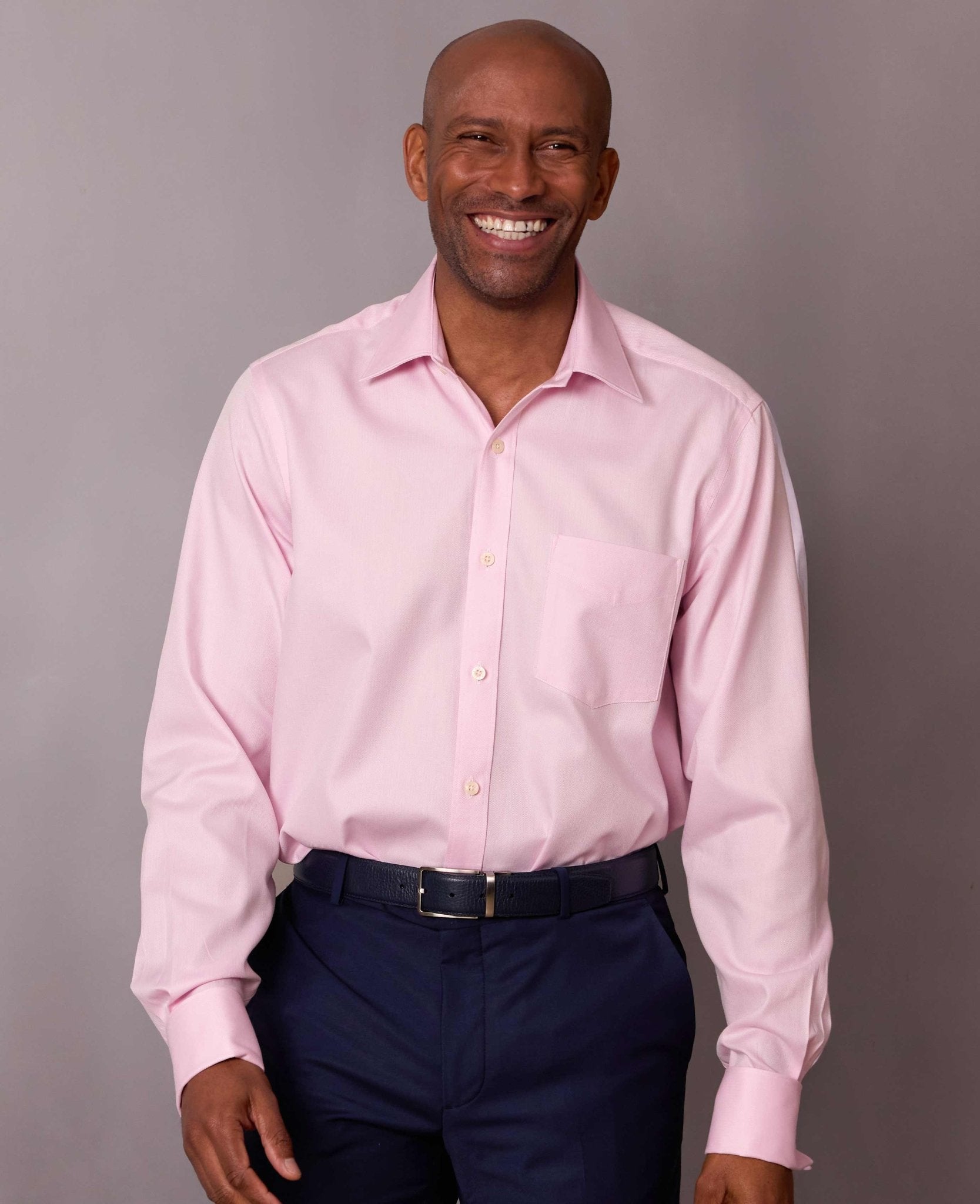 This pink formal shirt with double cuffs combines subtle texture with timeless elegance. Crafted from 100% cotton, the herringbone weave adds a refined pattern and depth to the fabric, creating extra visual interest without being overpowering. Soft, supple and easy to iron, it offers a generous classic fit, while a split back yoke and pucker-free French taped seams ensure comfort and a clean silhouette. Finished with a curl-resistant Windsor collar, this men’s shirt blends style and practicality.