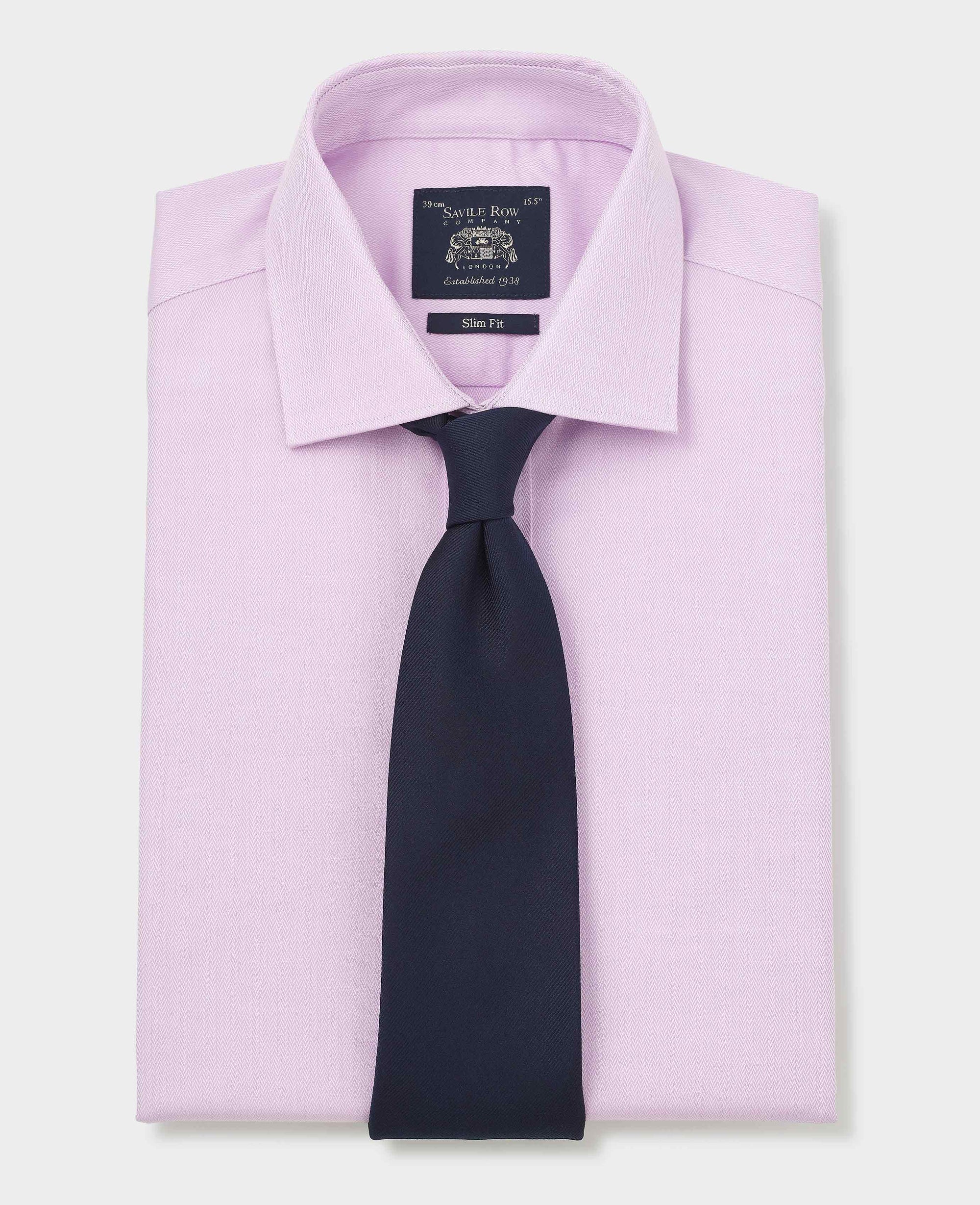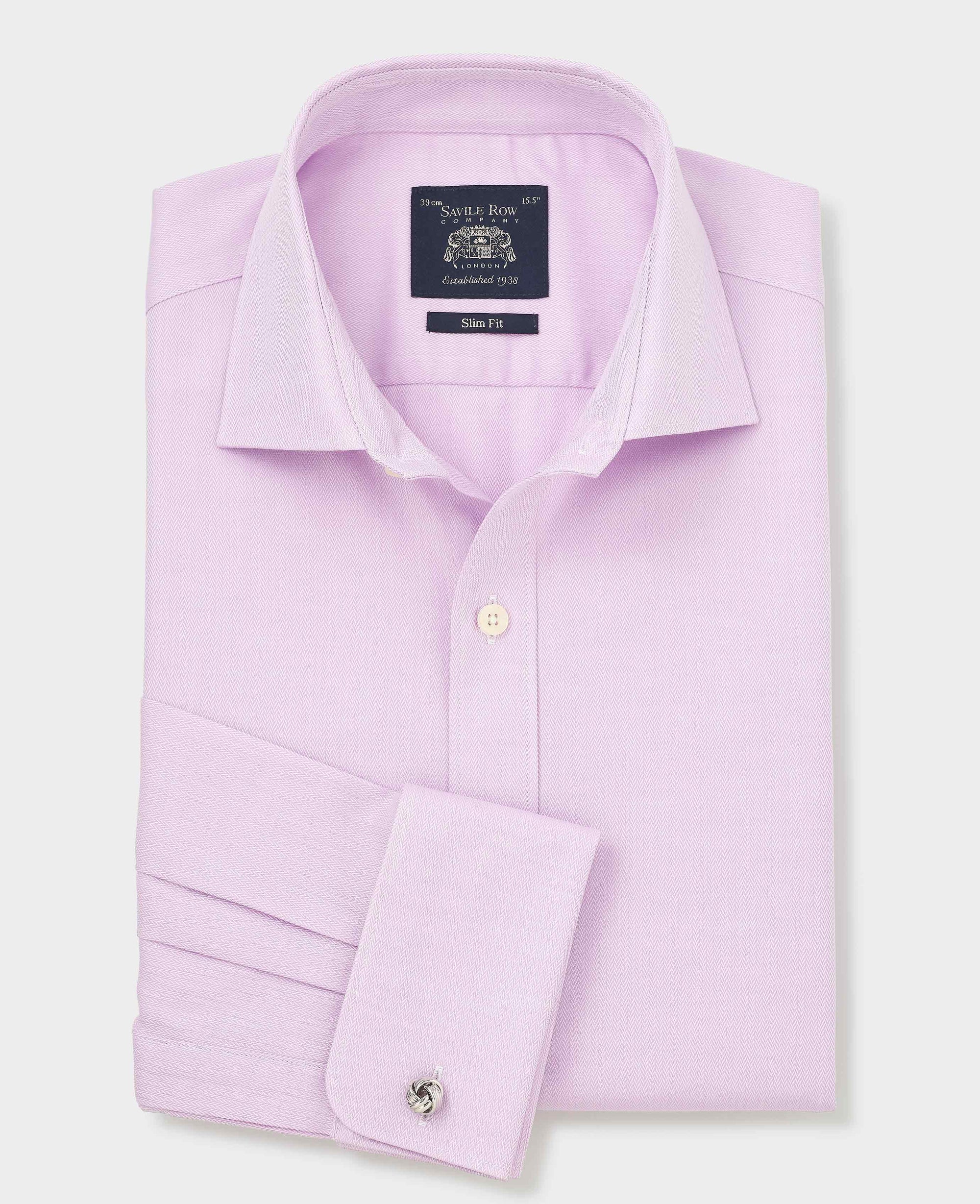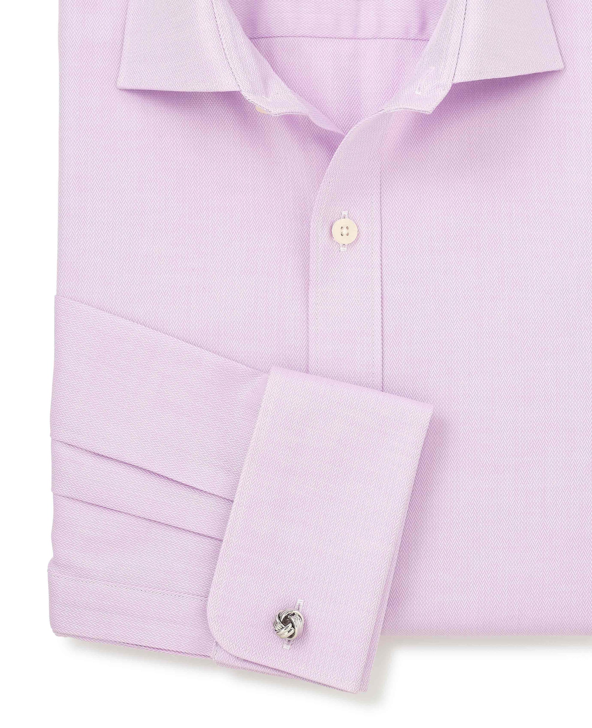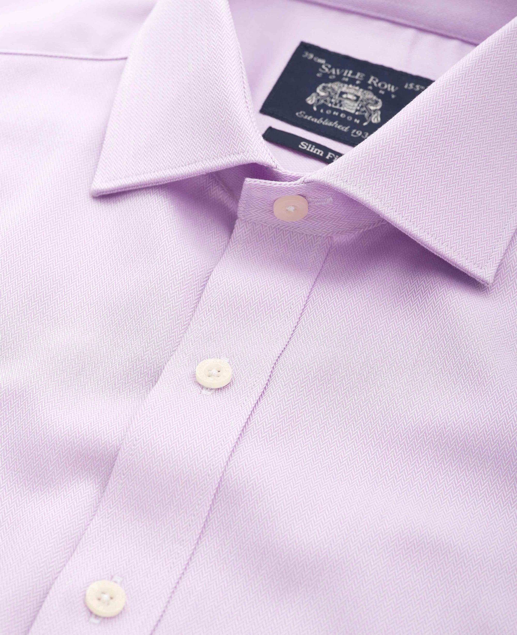 This lilac formal shirt with double cuffs is a must-have. Made from 100% cotton, the herringbone weave adds depth and visual interest, giving the fabric a refined, tactile finish. The slim fit is gently tapered for a flattering silhouette, while pucker-free French taped seams and a split back yoke ensure comfort and a clean, tailored look. Finished with a curl-resistant cutaway collar and double cuffs, it balances style and practicality.