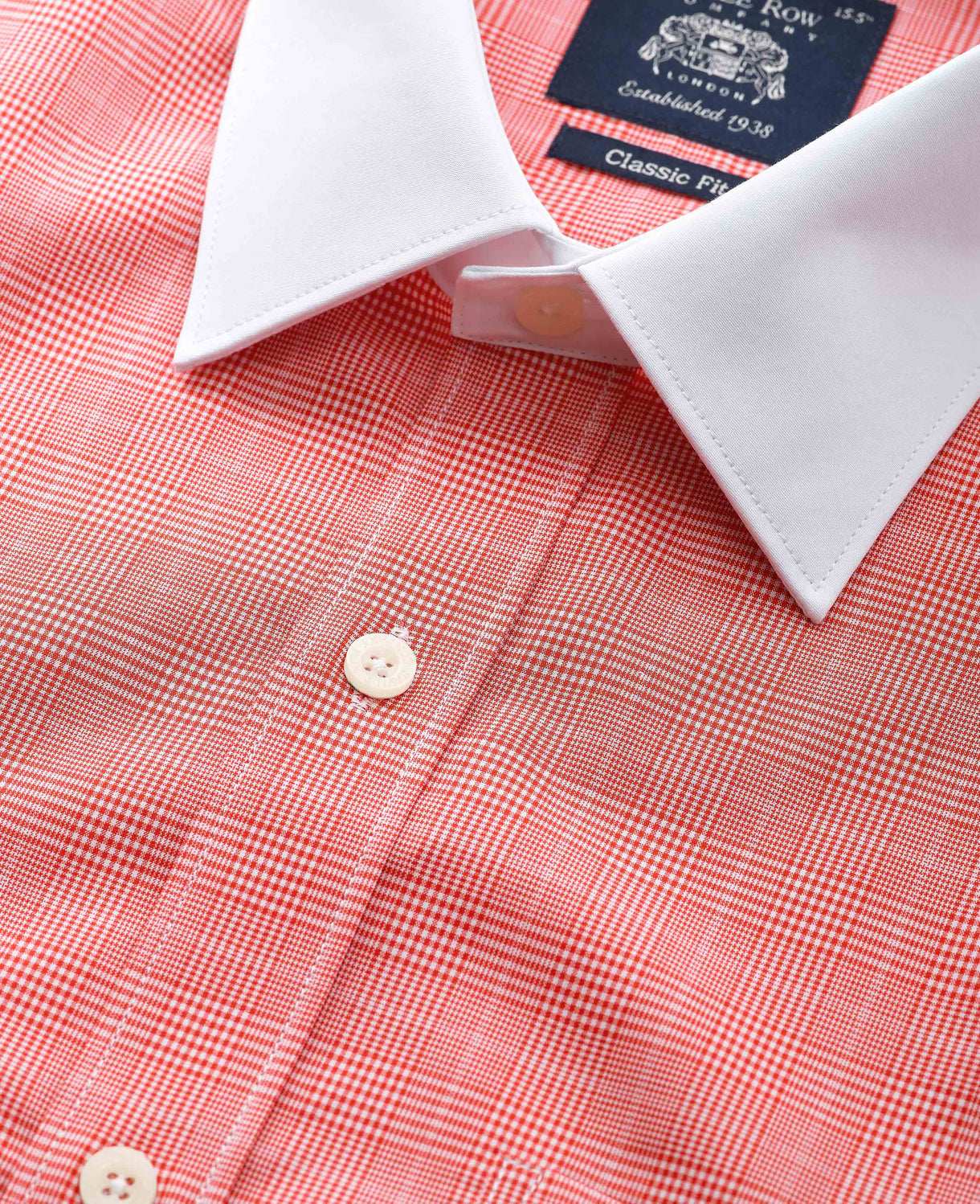 Bold yet unmistakably classic, our red Prince of Wales check Winchester shirt brings a distinctive edge to traditional formalwear. The rich check pattern, rooted in British tailoring heritage, adds depth and interest, while the crisp white contrast collar and double cuffs lend a refined, formal touch. Crafted from 100% poplin, the fabric is smooth, breathable and finished for easy ironing. The generously proportioned classic fit ensures comfort and ease of movement, complemented by thoughtful construction details like a curl-resistant Windsor collar with removable stays, pucker-free French taped seams, a split yoke and long tails for a clean tuck. With a chest pocket for everyday function, this is a formal shirt that blends tradition with personality.