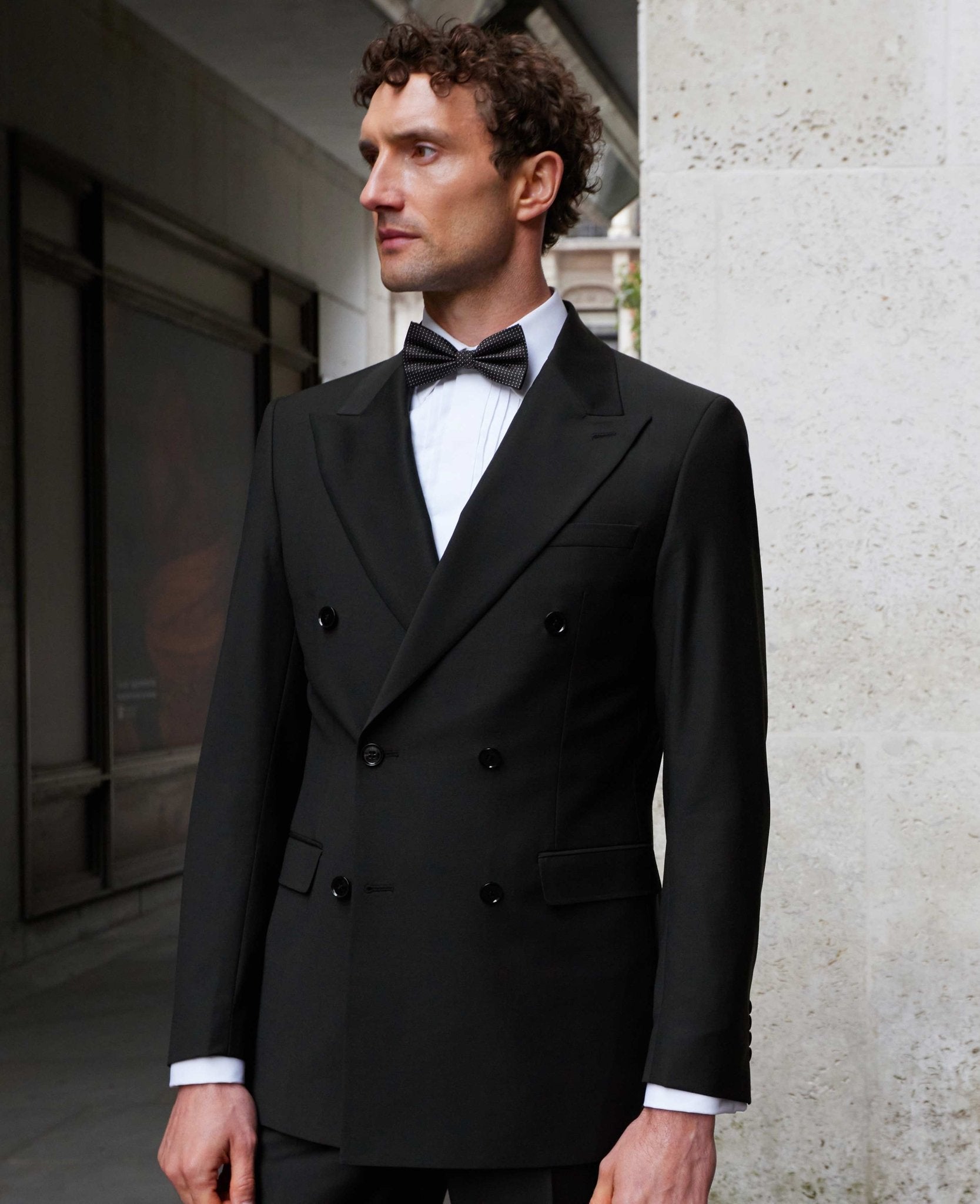 The ultimate wardrobe essential, this men’s black double breasted tailored suit is the definition of timeless style. Sleek, versatile and effortlessly elegant, it’s the kind of suit every man should own. Whether you're attending a formal event, making a strong impression at a business meeting or simply want to look sharp for a special occasion, this suit delivers every time. The jacket features a single-breasted, two-button front, two back vents and a rich burgundy lining, while the flat-front trousers offer a straight-leg silhouette for a clean, modern finish.