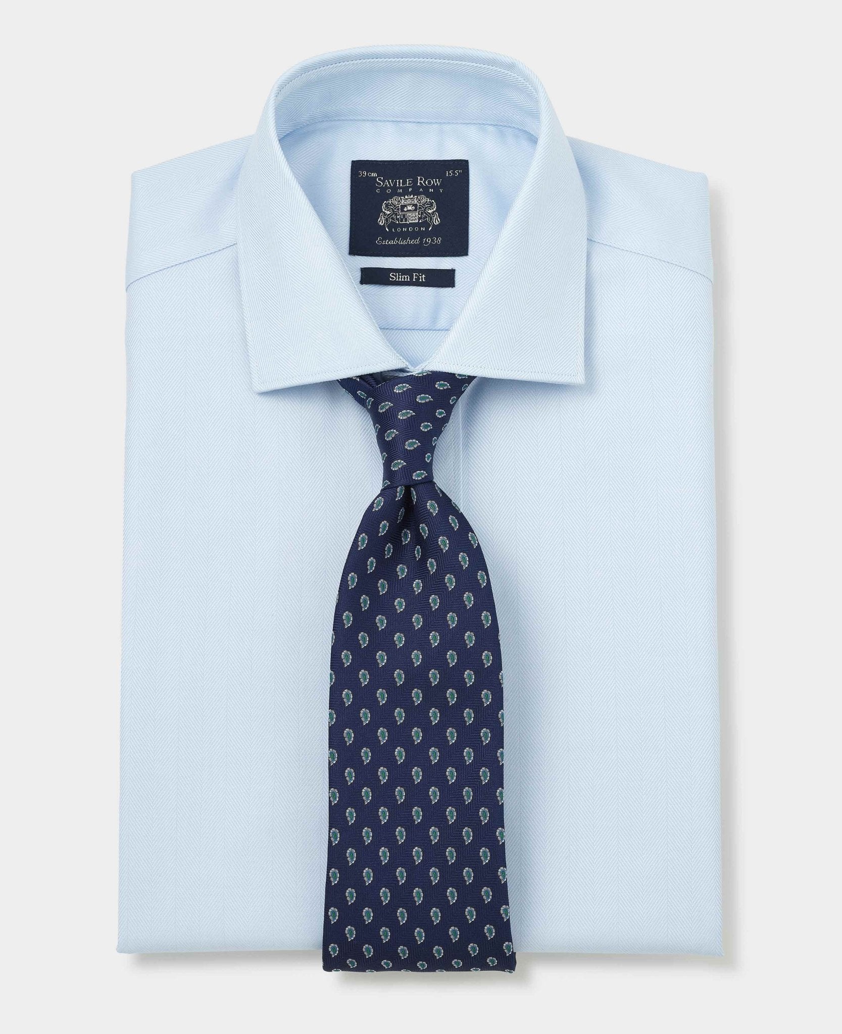 Cut from extra-fine cotton, this blue herringbone formal shirt balances smart design with everyday practicality. The subtle herringbone weave adds texture and depth without shouting for attention, while the soft, supple handle and easy-iron finish make it a dependable choice for busy weeks. A curl-resistant cutaway collar, complete with removable stays, keeps its shape from morning meetings to late finishes, and the slim, gently tapered fit is designed to flatter a wide range of builds. Finished with versatile single cuffs, this is a quality shirt you’ll reach for often.