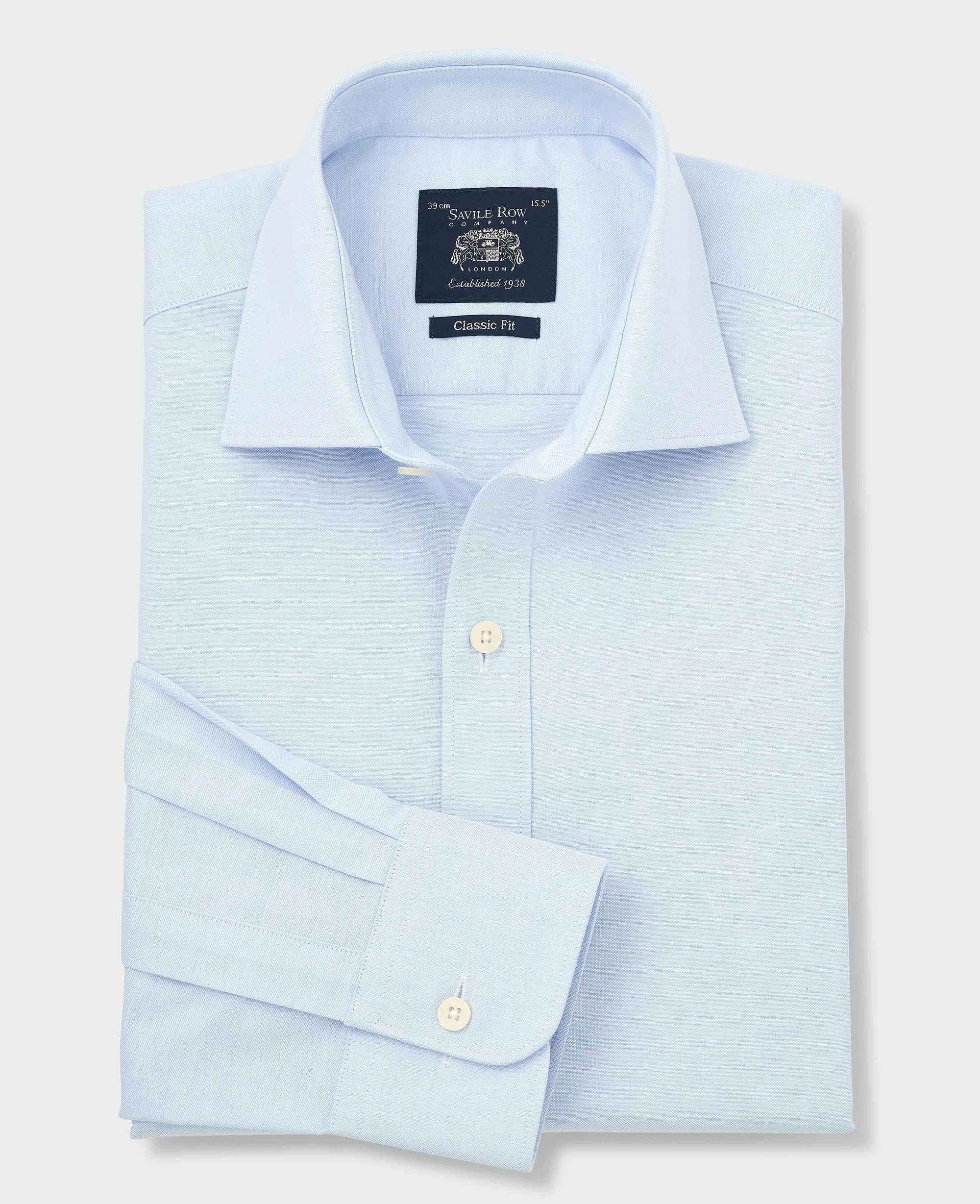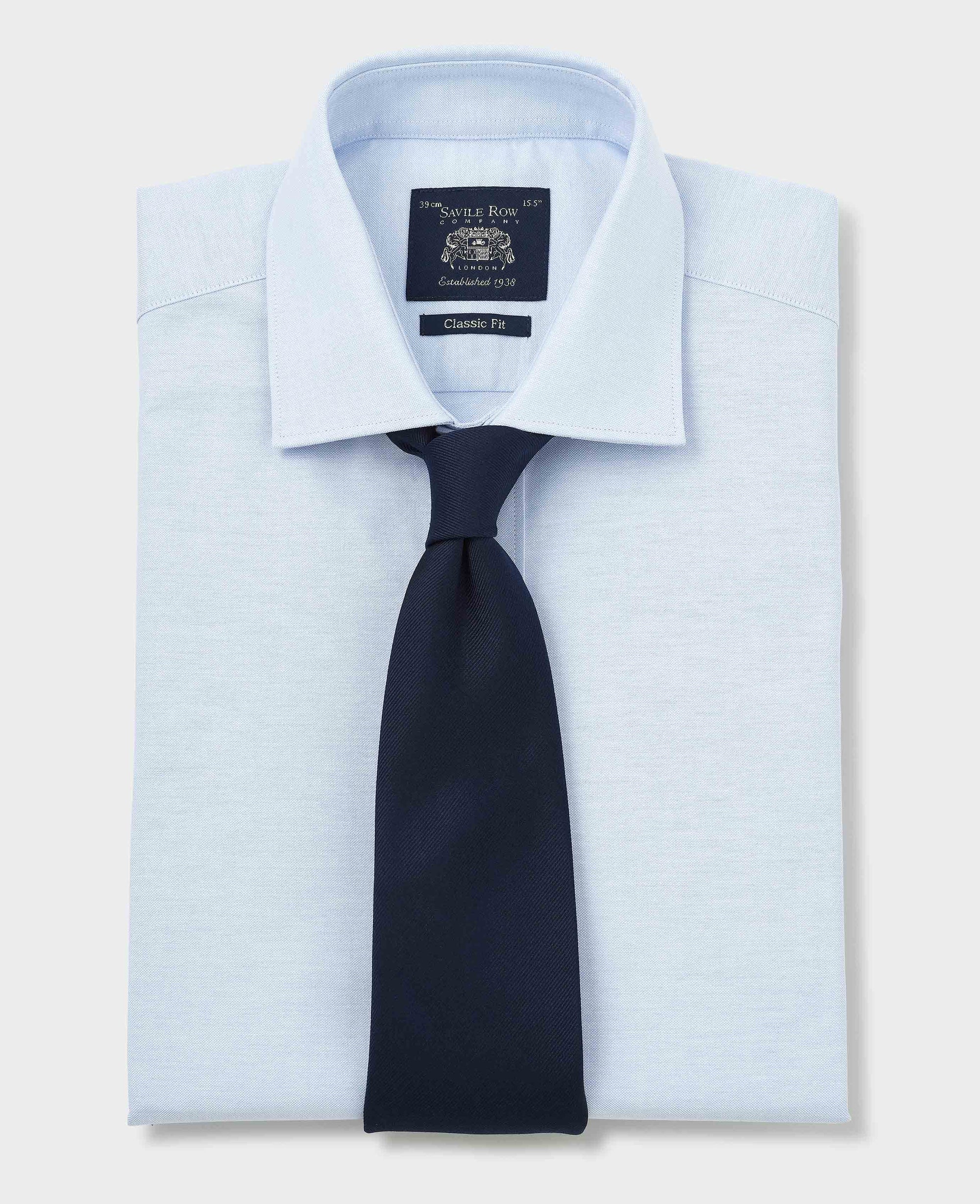 Upgrade your formalwear with this blue classic fit shirt, crafted from 100% pinpoint cotton. The fine, tightly woven yarns create a subtle pin-like texture, giving the fabric a distinctive yet refined appearance that blends the crispness of poplin with the slight texture of Oxford cloth. This high-thread-count fabric delivers durability, excellent drape and minimal wrinkling, making it a versatile choice for both office and weekend wear. Generously cut in a classic fit, it features a curl-resistant cutaway collar with removable stay, pucker-free French taped seams, a split back yoke for a better fit across the shoulders and a single cuff.