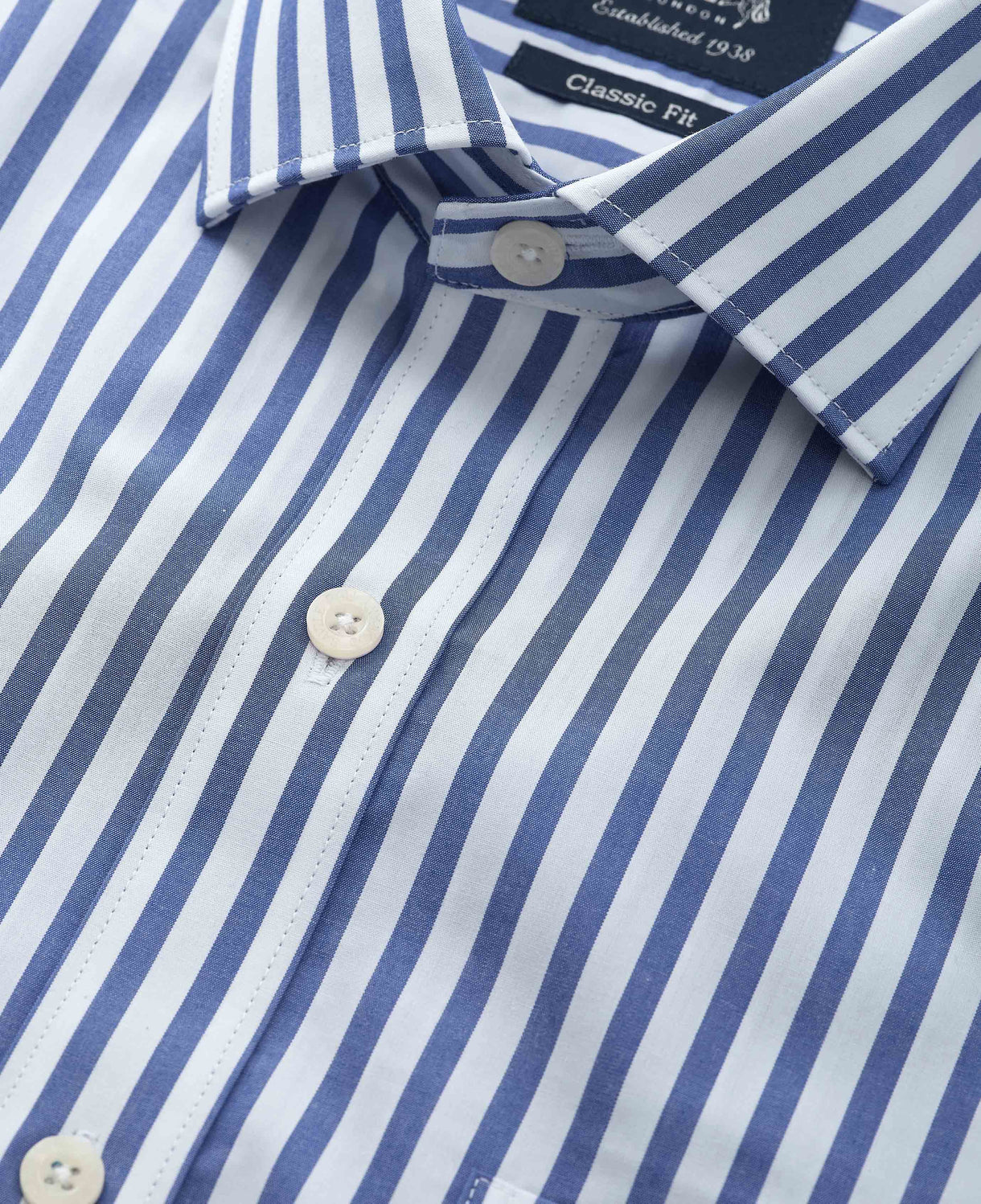 This blue and white striped shirt is shaped in a generously proportioned classic fit, ideal for those who value ease without compromise. Made from 100% cotton poplin, the fabric is smooth, breathable and softly structured, with an easy-iron finish that holds its crispness throughout the day. The curl-resistant cutaway collar with removable stays, double cuffs and neatly taped French seams reflect a quiet attention to detail that speaks to our heritage of craftsmanship since 1938. With a split yoke for improved movement, long tails for a tidy tuck and a practical chest pocket, this formal shirt balances form and function for everything from boardroom formality to everyday wear.