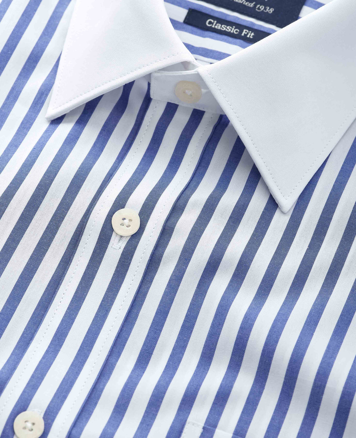 Rooted in a heritage of shirt making since 1938, our blue and white striped Winchester shirt offers a timeless silhouette with a more generous cut, designed for ease without sacrificing refinement. Made from 100% poplin, the fabric is smooth and tightly woven, delivering a crisp, breathable feel that stays sharp all day. The distinctive contrast white collar and double cuffs bring a traditional elegance, while thoughtful construction, like the curl-resistant Windsor collar with removable stays, pucker-free French taped seams, and a split back yoke, ensures both comfort and polish. Ideal for formal occasions or office days, it’s a formal shirt that quietly reflects decades of craftsmanship and enduring style.