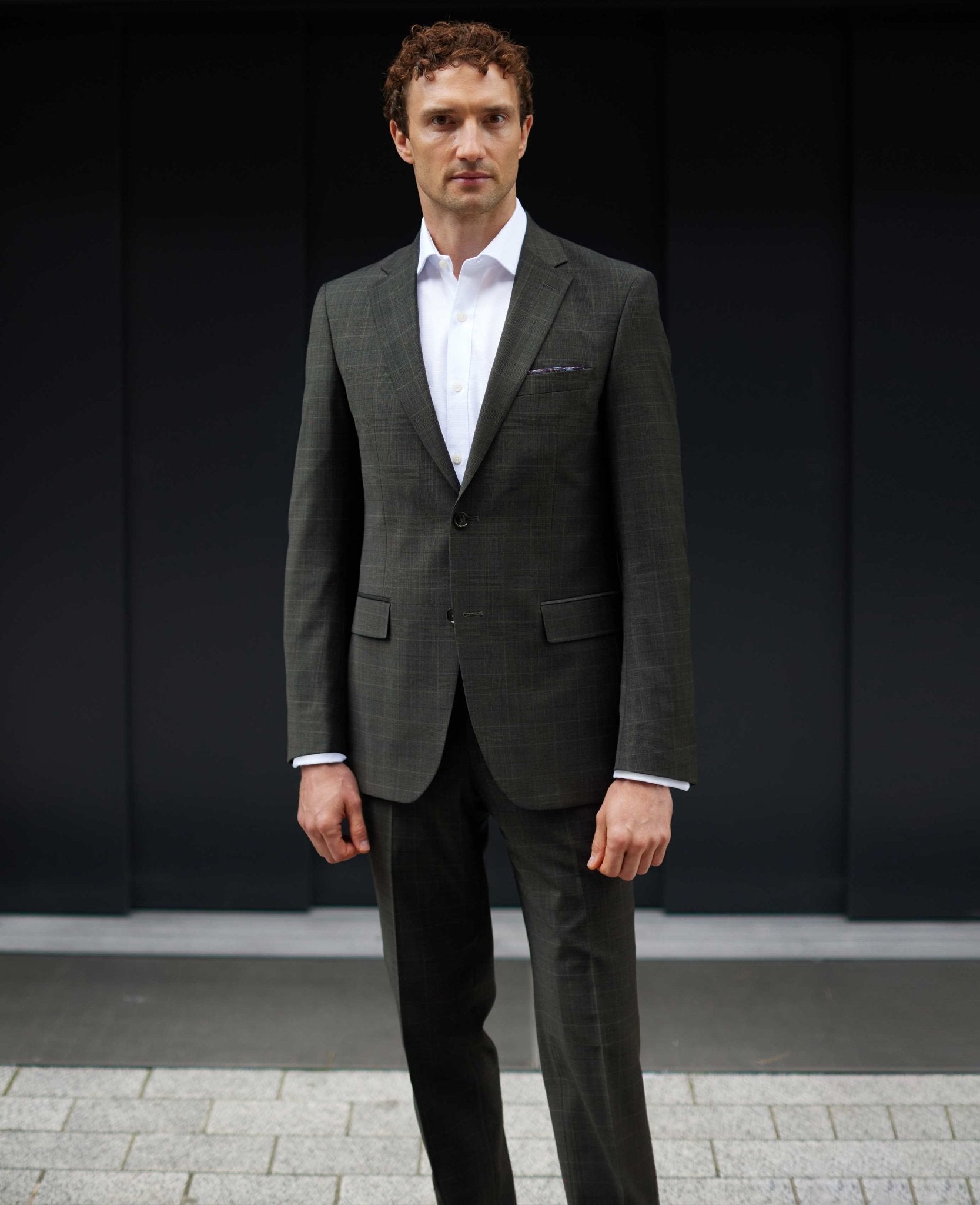Step into timeless British style. This grey Prince of Wales check suit blends classic tailoring with just the right amount of personality. The traditional check pattern speaks to heritage and refinement, while the clean silhouette gives it a contemporary edge that turns heads for all the right reasons. Tailored to perfection, this men’s suit includes a single-breasted, two-button jacket with double back vents for comfort and mobility. The matching flat-front trousers feature a smart, straight-leg cut for a sharp, polished look.