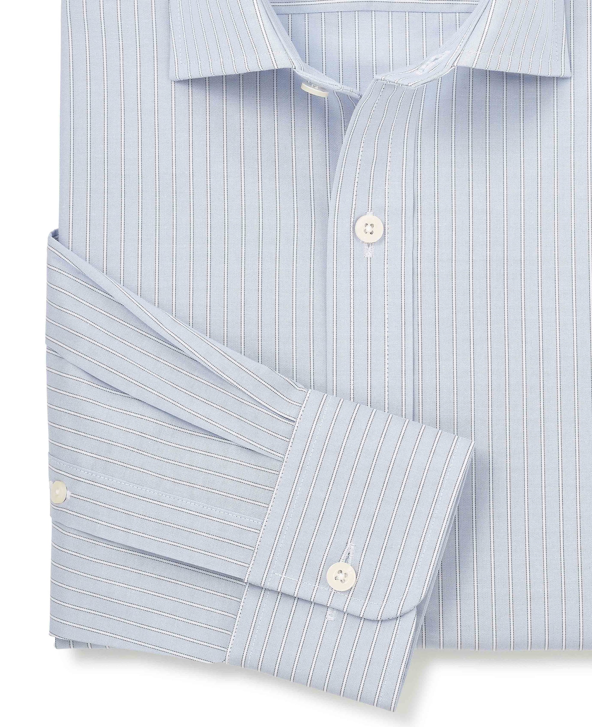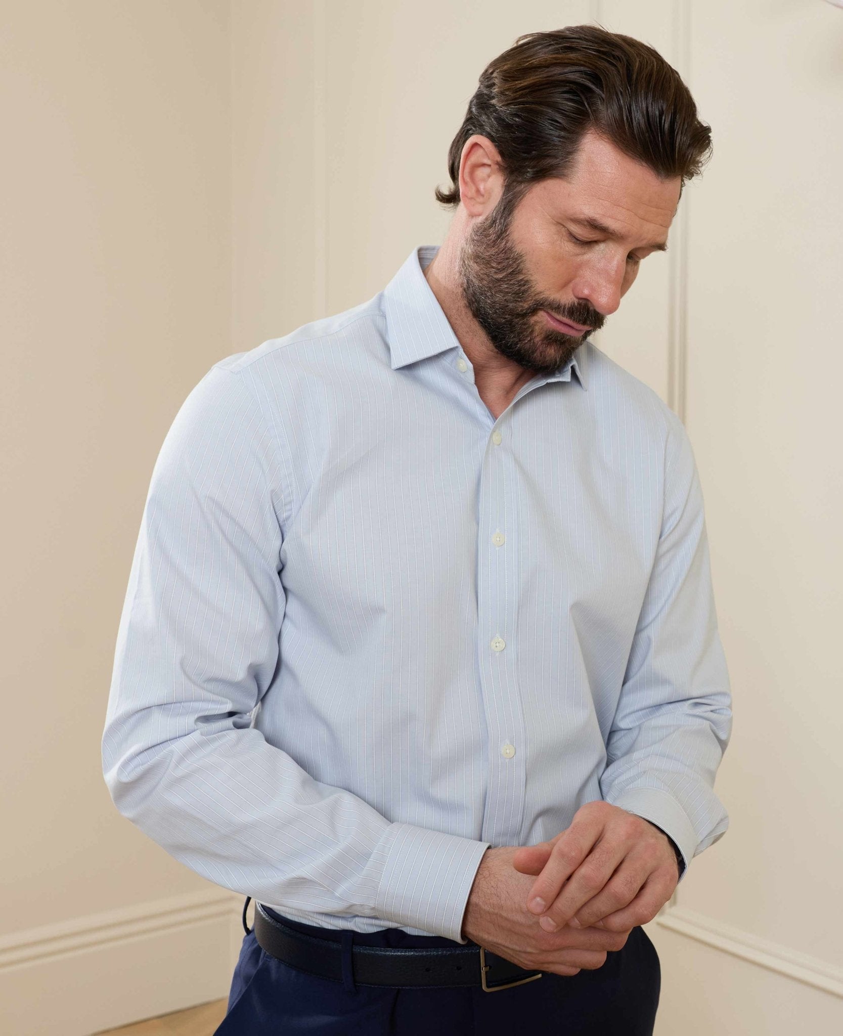 This wonderful formal shirt is crafted from pinpoint cotton (often considered a refined Oxford) woven in a tight, fine basketweave that gives it subtle texture, durability and everyday versatility. Sitting neatly between classic Oxford cloth and smooth poplin, it strikes the perfect balance in both feel and formality, making it just as suited to the office as it is to more relaxed occasions. Up close, the stripe reveals a depth and detail that elevates the overall look, while the slim fit offers a clean, gently tapered silhouette. Finished with single cuffs.