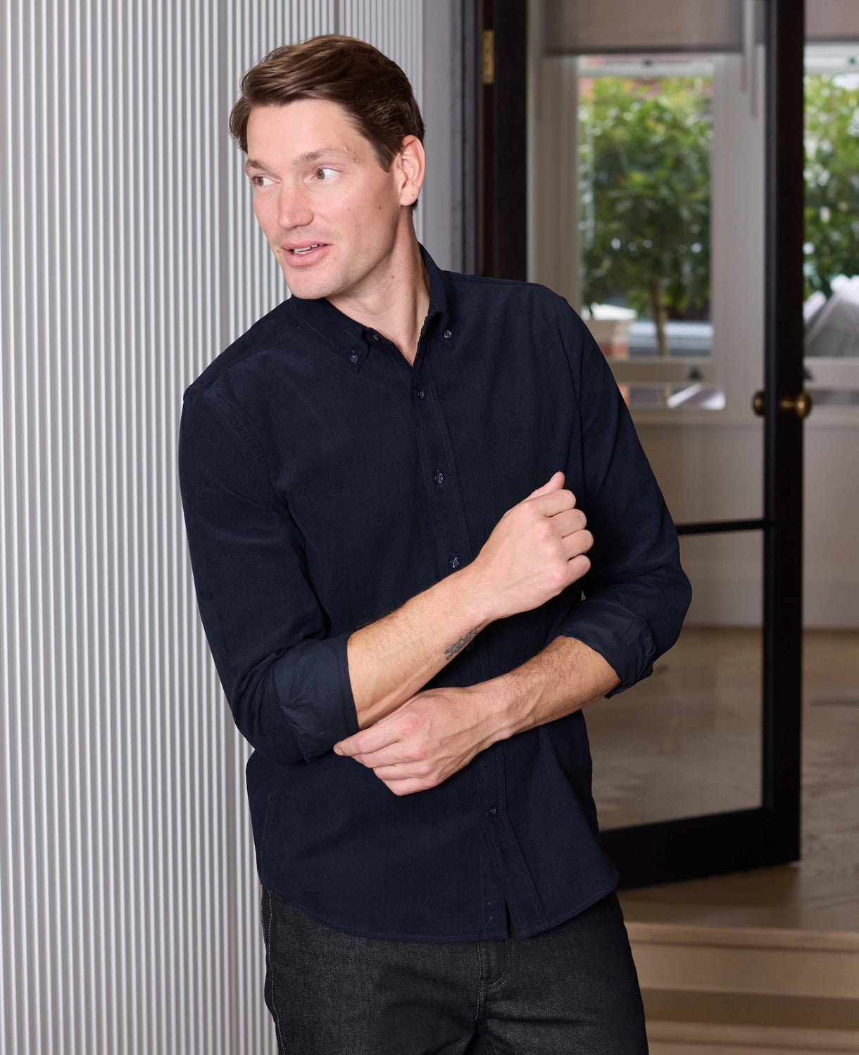 This navy casual shirt is cut from 100% cotton babycord, a fine-wale corduroy known for its velvety softness and lasting durability. Ideal for cooler weather, the fabric offers a cosy feel without compromising on breathability. Tailored in a slim fit with a gently tapered shape, it’s a refined take on casual dressing. The button-down collar, single cuffs, split yoke and two back darts ensure a clean silhouette and comfortable fit, whether worn on its own or layered under knitwear.
