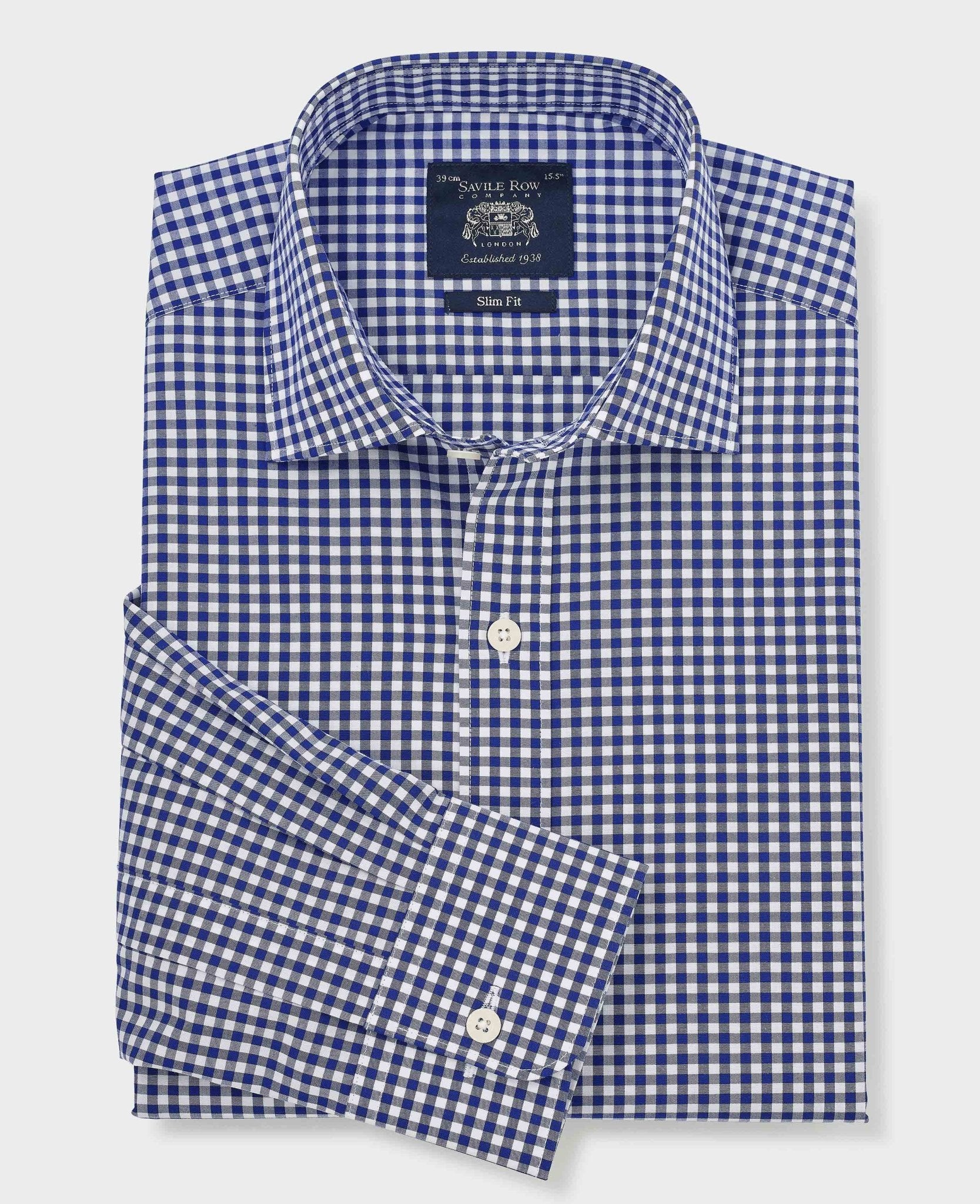 This navy gingham check formal shirt is a smart way to add subtle character to your everyday tailoring. Cut from 100% cotton poplin, the fabric is smooth, lightweight and breathable, making it ideal for long days at the office or busy weeks on the move. The crisp poplin weave holds its shape well and features an easy iron finish, so it looks sharp with minimal effort. A flattering slim fit with a gently tapered silhouette works across all builds, while thoughtful construction details – including pucker-free French taped seams and a split back yoke – ensure comfort and a clean line through the shoulders. Finished with a curl-resistant cutaway collar with removable stays and a versatile single cuff that can be worn buttoned or with cufflinks.