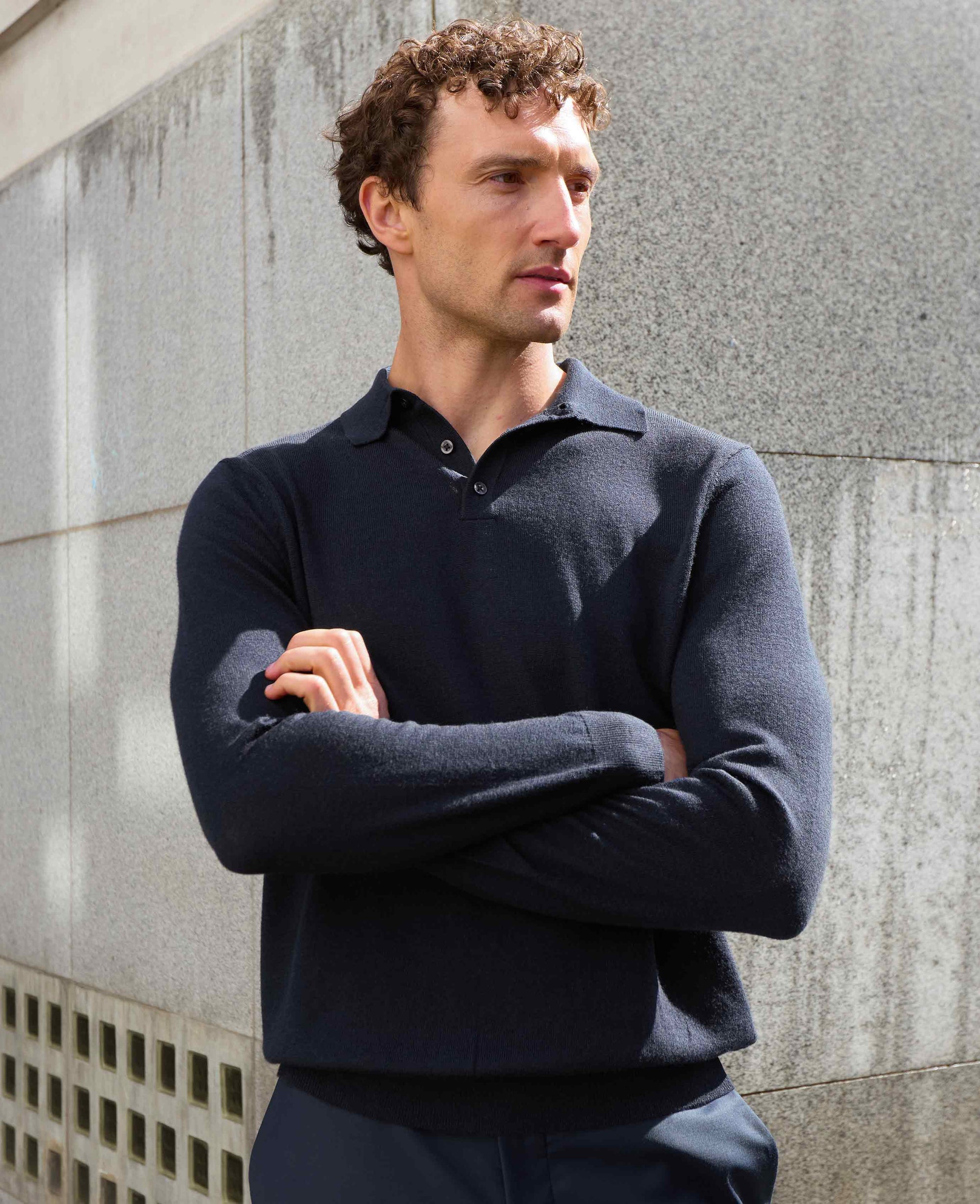 Indulge in the luxurious feel of this navy knitted polo shirt, designed for the gentleman who values both comfort and style. Made from 12-gauge extra-fine non-mulesed Merino wool, this piece is incredibly soft against the skin while offering just the right amount of warmth. The regular fit, paired with fully fashioned sleeves, delivers a flattering silhouette that’s as comfortable as it is stylish.