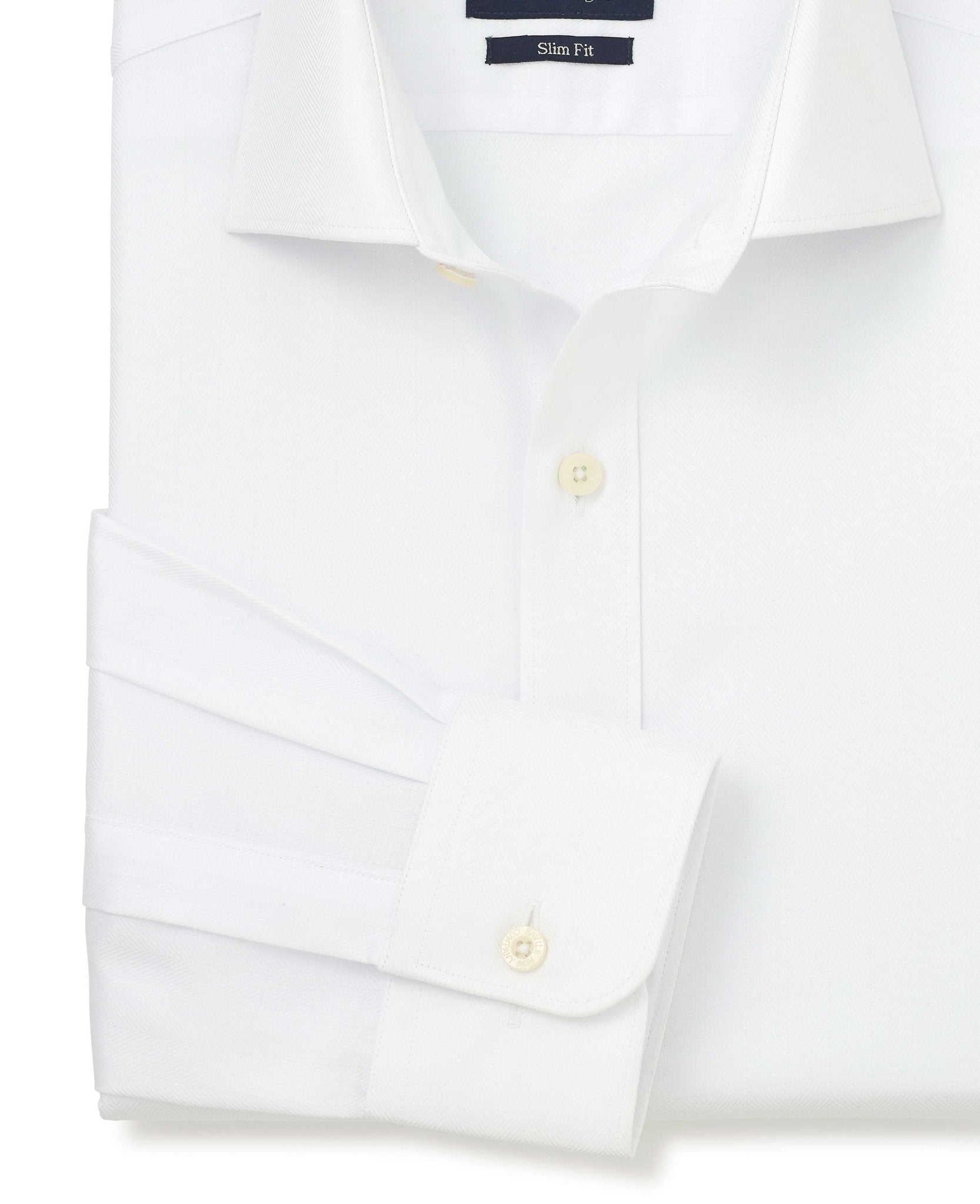 Clean, crisp and quietly refined, this white formal shirt is built for everyday polish. Cut from extra-fine cotton, the subtle herringbone weave adds depth while remaining soft, breathable and easy to iron. A curl-resistant cutaway collar with removable stays keeps things sharp throughout the day, while the gently tapered slim fit, split back yoke and pucker-free French taped seams ensure comfort and a flattering shape across all builds. Finished with versatile single cuffs that can be worn buttoned or with cufflinks, it’s a hardworking classic that transitions effortlessly from office to occasion.