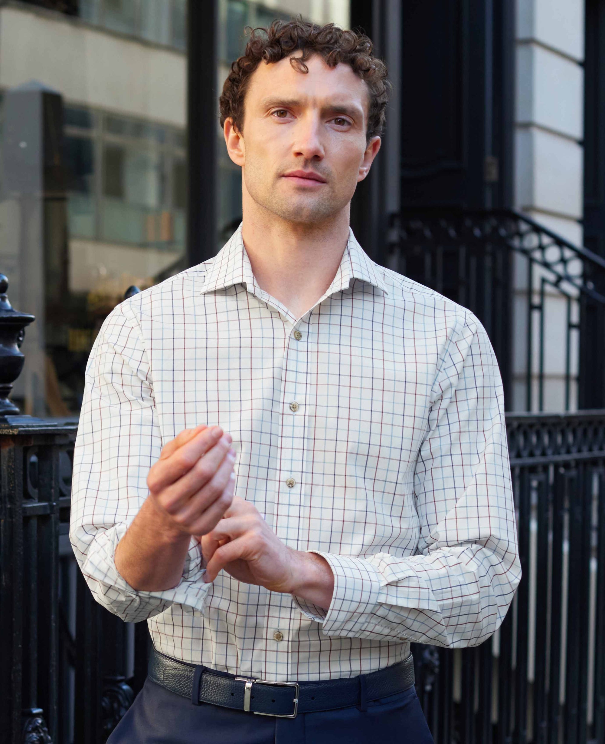 This white and red Tattersall check shirt is a classic. The clean grid pattern adds visual interest without overpowering, making it a versatile choice for both business and smart-casual settings. Crafted from 100% cotton poplin, the fabric is smooth, lightweight and naturally breathable, with an easy-iron finish that keeps you looking sharp all day. The slim fit is gently tapered to flatter all builds, while the curl-resistant cutaway collar, with its removable stay, maintains a crisp, structured look. Finished with single cuffs, a split yoke and two back darts.